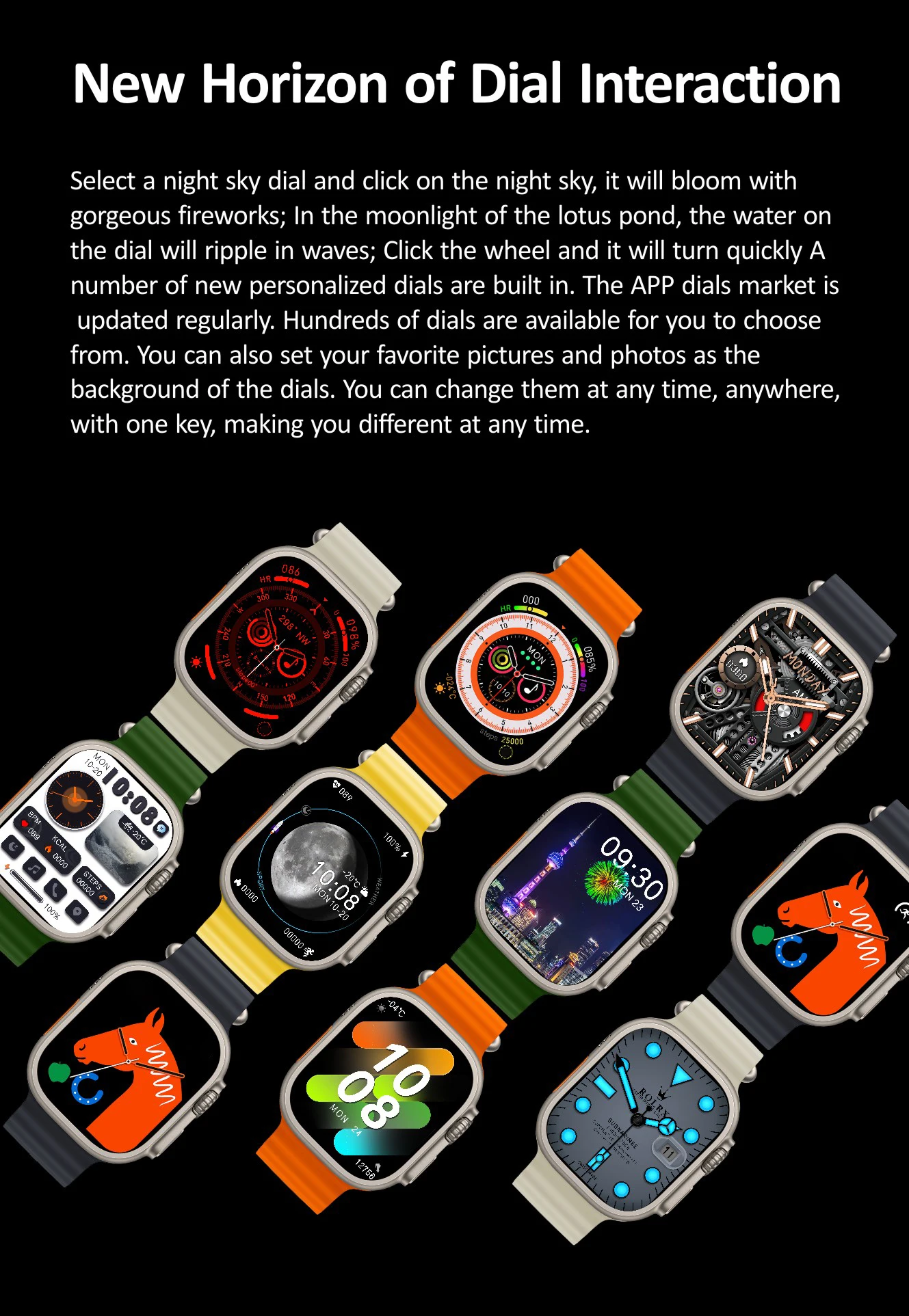 Wählen Sie ein Nachthimmel-Zifferblatt und klicken Sie auf den Nachthimmel. Es blüht mit einem wunderschönen Feuerwerk. Im Mondlicht des Lotus teichs wird das Wasser auf dem Zifferblatt in Wellen kräuseln. Klicken Sie auf das Rad und es wird schnell eine Reihe neuer personal isierter Ziffer blätter eingebaut. Die App wählt Markt wird regelmäßig aktualisiert. Hunderte von Ziffer blättern stehen zur Auswahl. Sie können auch Ihre Lieblings bilder und Fotos als Hintergrund der Ziffer blätter einstellen. Sie können sie jederzeit und überall mit einem Schlüssel ändern, sodass Sie jederzeit unterschied lich sind.