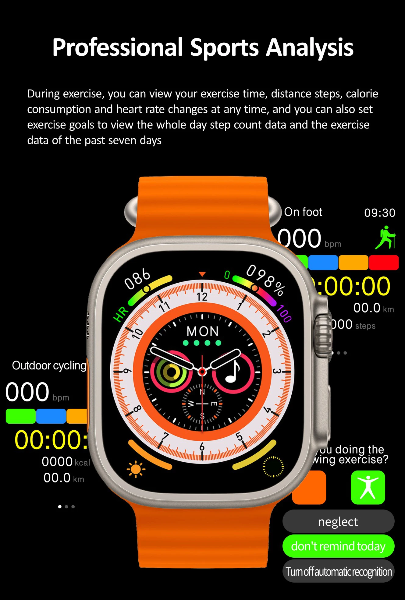 Profession elle Sport analyze, Übungs zeit, Entfernung, Schritte, Kalorien verbrauch und Herzfrequenz änderungen jederzeit überprüfen, können Sie auch Übungs ziele setzen, sehen Sie sich die ganztägigen Schritt zähl daten und die Sieben-Tage-Trainings daten an.
