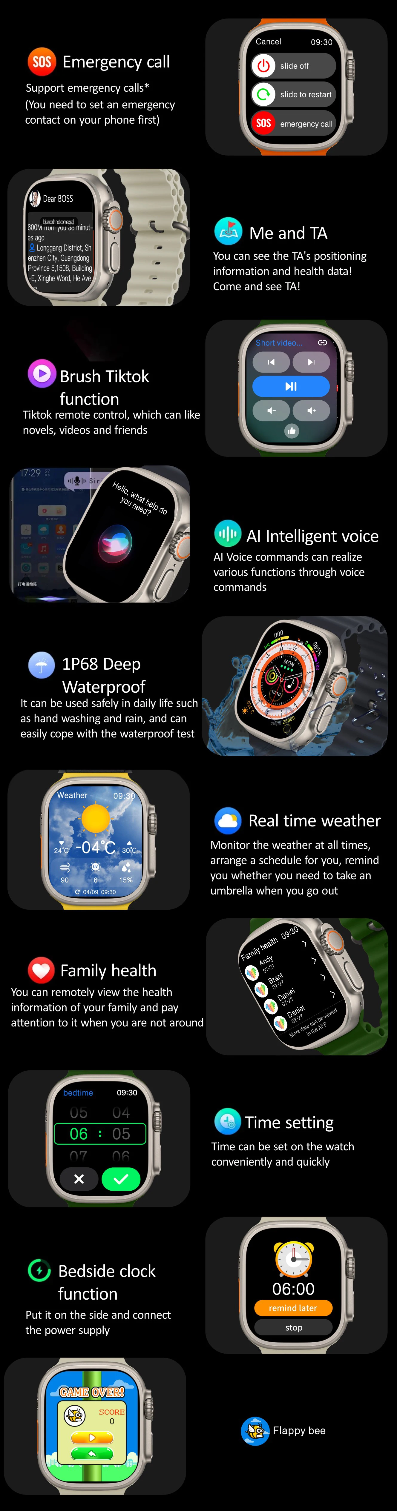Schlaf überwachung, sitzende Erinnerung, Anruferin nerung, Nachrichten erinnerung, Stoppuhr, Musik steuerung, Bluetooth-Musik wiedergabe, Fotos teuerung, Anti-Verlust, Wecker wetter, App-Wähl schub, unterstützung manuelle Einstellung von Zeit und Datum, ai Sprach assistent“
