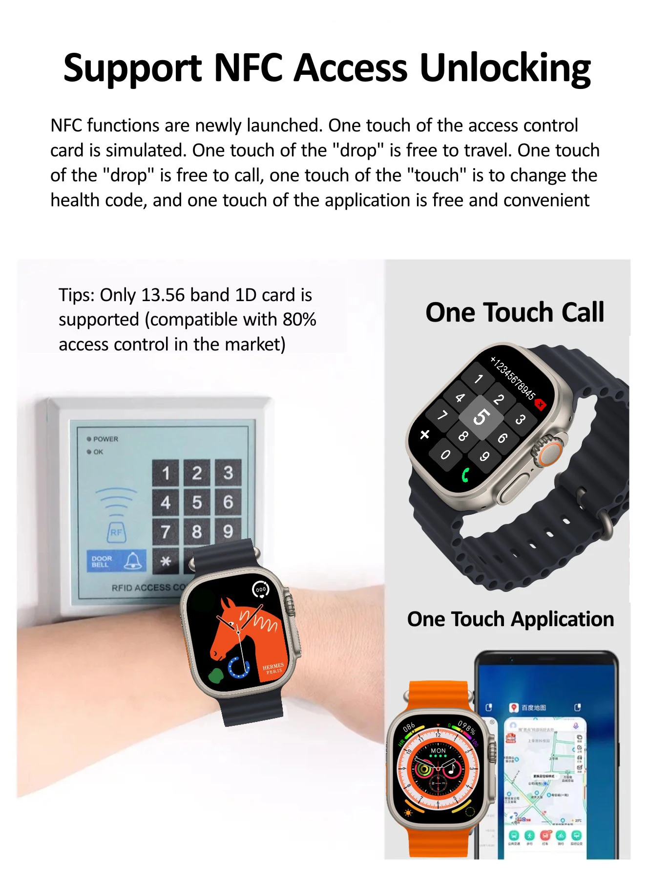 1. die nfc dieser uhr unterstützt nur als ic tür karten mit einer frequenz von 13,56 mnz (anwendbar auf 80% auf dem markt), unterstützt nicht andere funktionen.