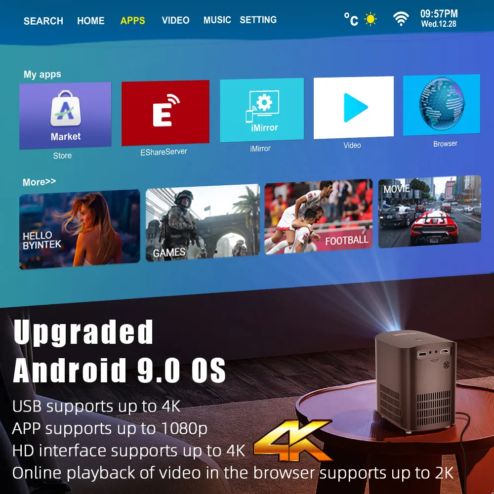 Mit dem optimierten Android 9,0-System können Sie einige Apps herunter laden und installieren und das Online-Ansehen von Filmen unterstützen.